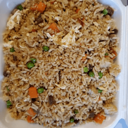 Baby shrimp, chicken breast, BBQ pork, or beef. Includes 1 crab rangoon, egg or spring roll or soup. Attention: Has egg, peas & carrots unless otherwise specified