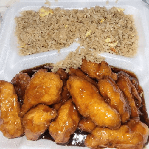 Battered chicken, sautéed with honey sauce. It is honey chicken good. Includes: 1 crab rangoon, fried or white rice egg/spring roll or soup.