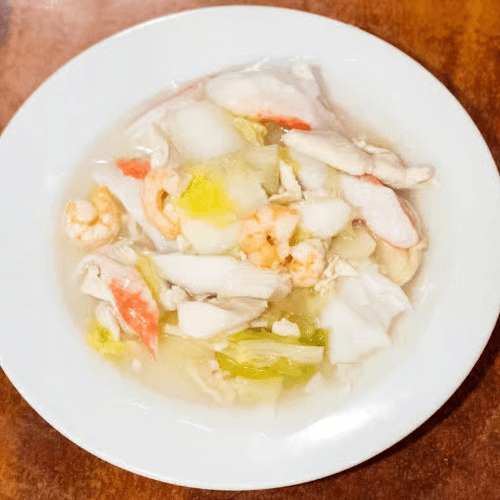 Lightly battered fried shrimp, topped with fresh veggies, and served with sweet and sour sauce on the side. Includes: 1 crab rangoon, fried or white rice, egg/spring roll or soup.
