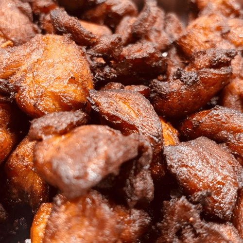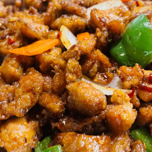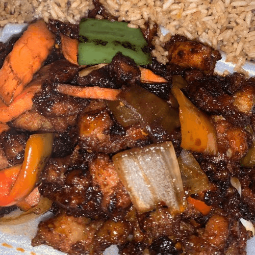 Chicken strips or diced chicken stir fry with green pepper, red pepper and yellow onion. It’s hot and it’s sweet. It’s flavorful and delicious. Includes: 1 crab rangoon, fried or white rice egg/spring roll or soup.