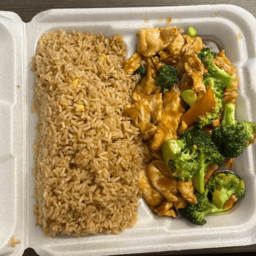 Fresh broccoli, crunchy water chestnuts, bamboo shoots and carrots sautéed with sliced chicken breast. Includes: 1 crab rangoon, fried or white rice egg/spring roll or soup.