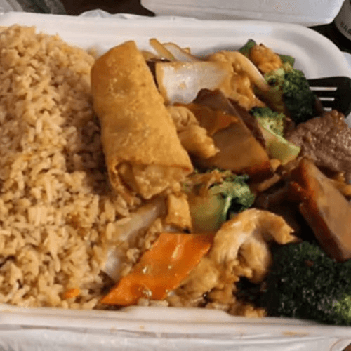 Includes: 1 crab rangoon, fried or white rice, egg/spring roll or soup (wonton soup, egg drop soup, or hot & sour soup)