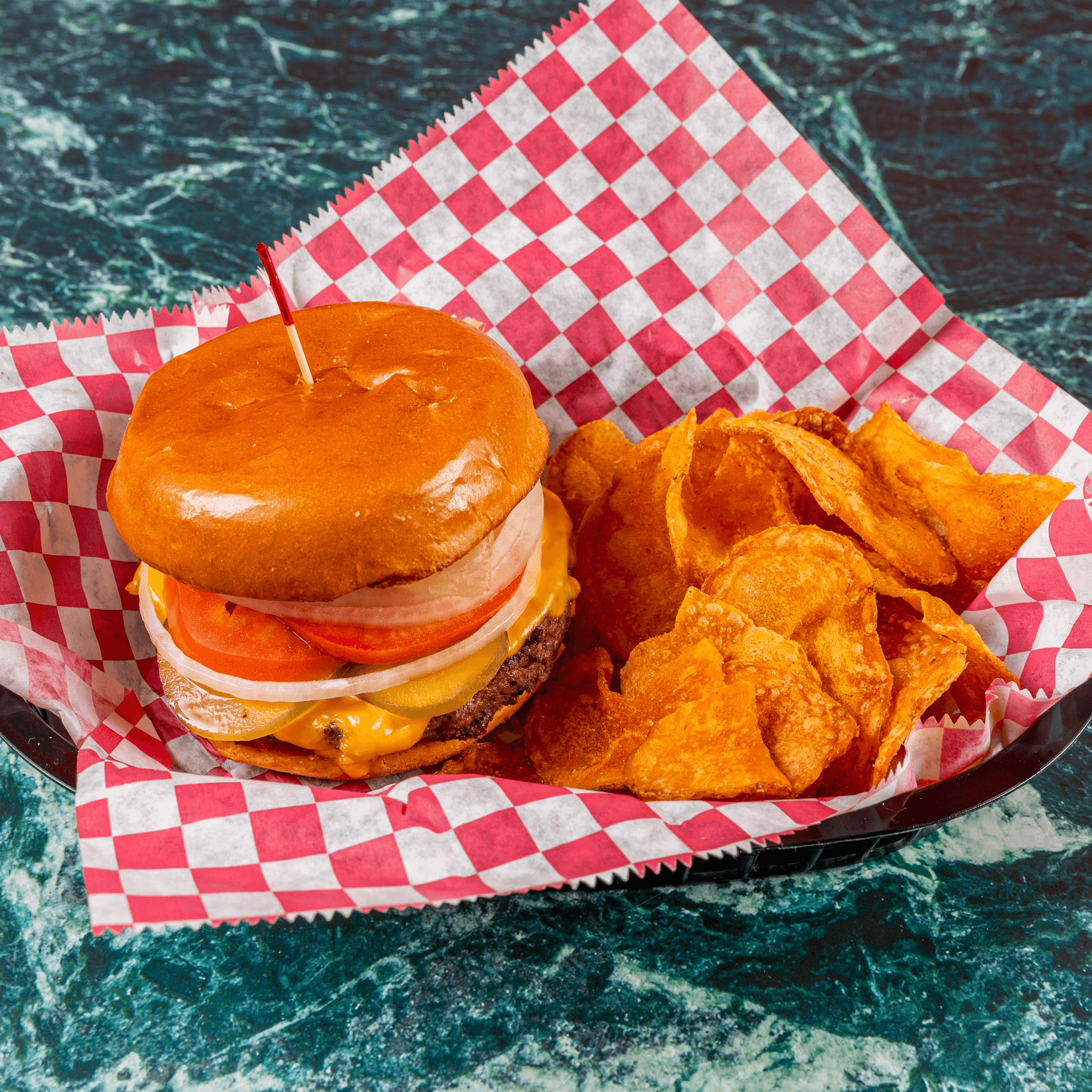 Char-broiled, all-beef patty served with lettuce, tomato, mayo, onion, and pickles on a toasted bun