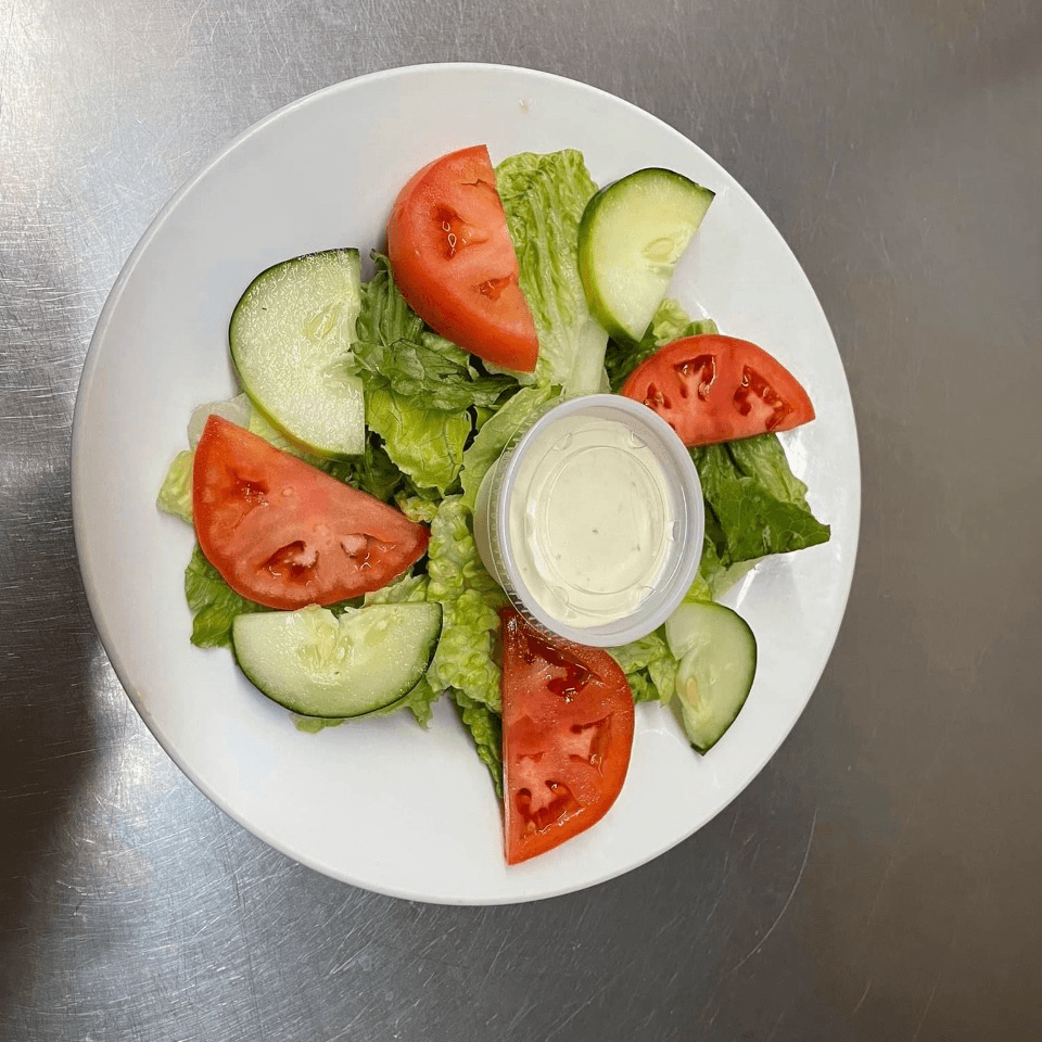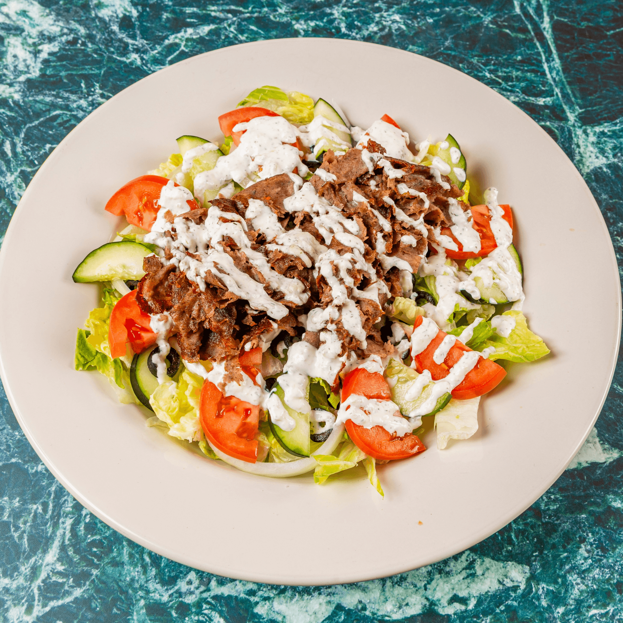 Chopped gyro meat served with onions, tomatoes, cucumbers, and black olives, on romaine lettuce with homemade tzatziki sauce