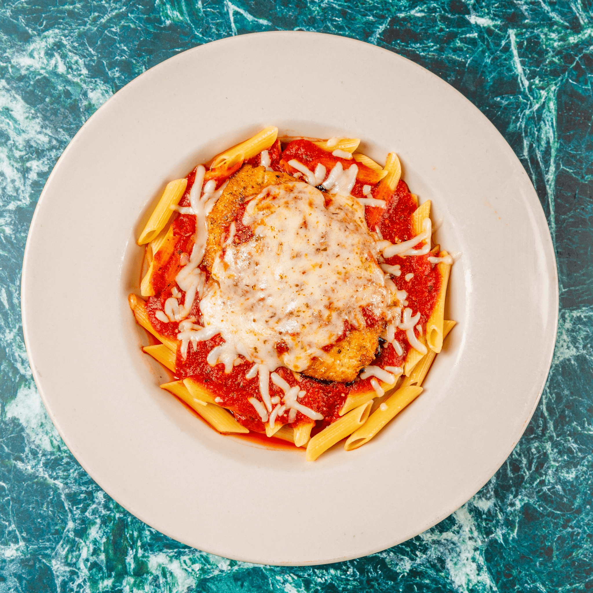 Lightly breaded and baked chicken breast topped with marinara and melted mozzarella, and served on a bed of penne